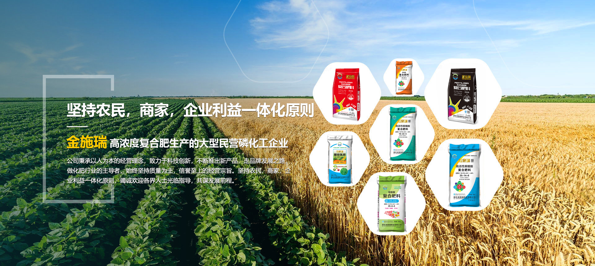 湖北金施瑞肥業(yè)有限公司是一家以生產高濃度復合肥為主導產品的大型民營磷化工企業(yè),在湖北、河南等地均建有大型的現代化生產基地。根據各地的土壤情況不同由本公司專業(yè)的研發(fā)機構專門為各地區(qū)研制不同配方的化肥,真正做到測土配方施肥。